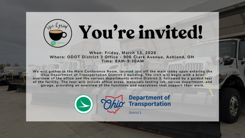Join the Ashland Young Professionals for our March Rise & Grind coffee networking event on Friday, March 13th at the Ohio Department of Transportation District 3 office, located at 906 Clark Avenue in Ashland. We’ll gather in the Main Conference Room, just off the main lobby when you enter the building. Enjoy coffee and networking while learning more about ODOT through a brief overview of their office and departments, followed by a guided tour of the facility—including office spaces, the test lab, survey department, garage, and more. Come connect, caffeinate, and get an inside look at ODOT—we hope to see you there!