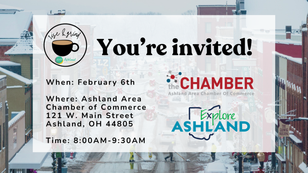 You’re invited to a Rise & Grind Coffee Networking Event for young professionals on Friday, February 6, at the Ashland Area Chamber of Commerce, located at 121 W. Main Street, Ashland. Stop by anytime between 8:00 AM and 9:30 AM to check out the Chamber’s new space, connect with fellow professionals, and learn more about the meaningful work being done by the Chamber staff and Explore Ashland team. Enjoy coffee, donuts, and plenty of open networking time as you start your morning off right. We hope you’ll take a moment to join us and make some great connections! We look forward to seeing you there!