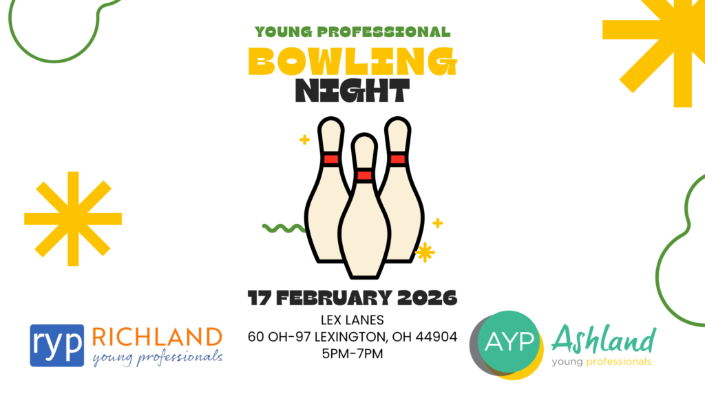 You’re invited to a Young Professional Bowling Night! Big ideas happen when great people connect! Ashland Young Professionals and Richland Young Professionals are teaming up for a collaborative night of bowling, networking, community, and fun at Lex Lanes, 60 State Route 97, Lexington, OH, 5PM-7PM. Come meet new faces, make meaningful connections, and grow your circle! $16 per person - 1.5hrs of bowling (including shoes) two slices of pizza and a soda We look forward to seeing you there!
