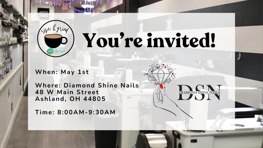 Join fellow members of Ashland Young Professionals for a special Rise & Grind Coffee Networking event on Friday, May 1st at Diamond Shine Nails! Pop in anytime between 8:00 and 9:30 AM to connect with other area young professionals, enjoy a fresh cup of coffee, and learn more about the services and offerings at this local business. Saionara Frederick and her team are excited to welcome you into their space for a relaxed and engaging morning of networking.