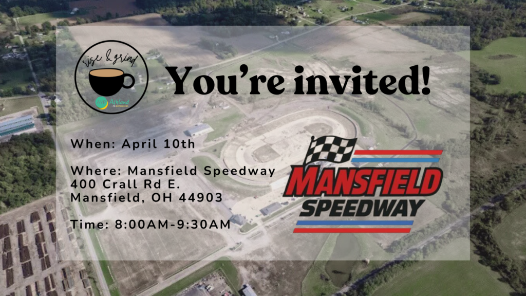 Join Ashland Young Professionals for our next Rise & Grind coffee networking event on Friday, April 10th at the Mansfield Speedway! Stop by anytime between 8:00 and 9:30 AM to enjoy fresh coffee, pastries, and great conversation with fellow young professionals. We’ll also host a casual “Meet the Team” roundtable and offer an exclusive behind-the-scenes look at the exciting progress being made to restore our beloved Mansfield Speedway. Come connect, learn, and start your day energized—we’d love to see you there!
