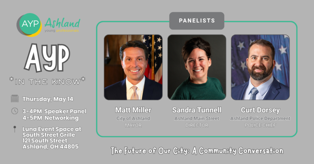 Join Ashland Young Professionals for *AYP In the Know: The Future of Our City—A Community Conversation* on Thursday, May 14th at Luna at the South Street Grille. From 3:00–4:00 PM, hear from a dynamic panel featuring Mayor Matt Miller, Ashland Main Street Executive Director Sandra Tunnell, and Police Chief Curt Dorsey as they share insights on current initiatives, upcoming projects, and what lies ahead for Ashland over the next two years. This is a great opportunity to meet the city’s new police chief and learn about his vision for public safety, followed by an engaging audience Q&A. Stick around from 4:00–5:00 PM for optional networking, with heavy appetizers and non-alcoholic beverages provided; alcoholic beverages will also be available for individual purchase. We would be honored to have you join us for this informative and engaging event!